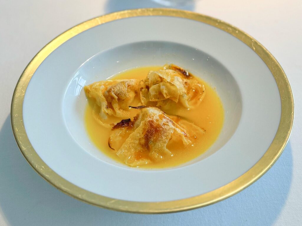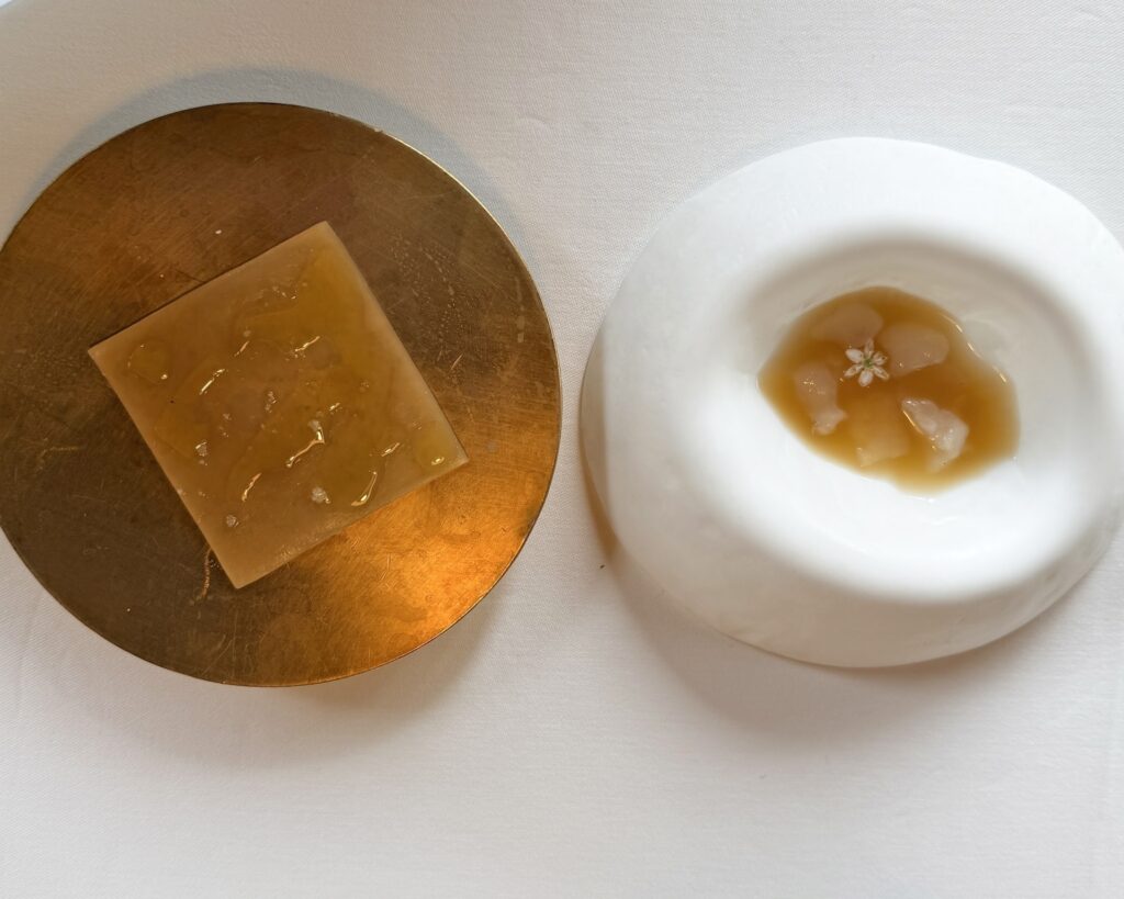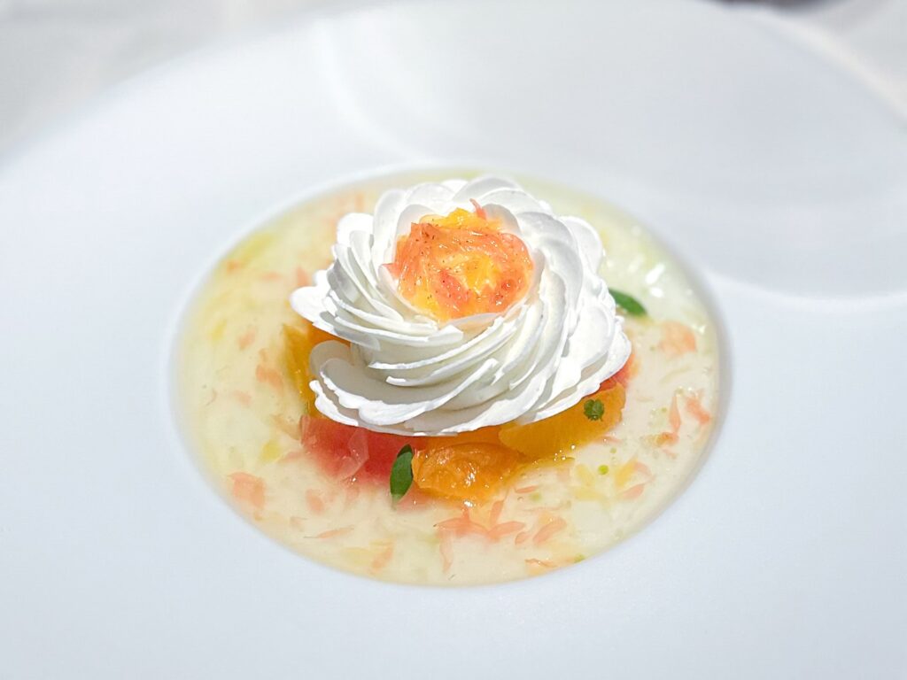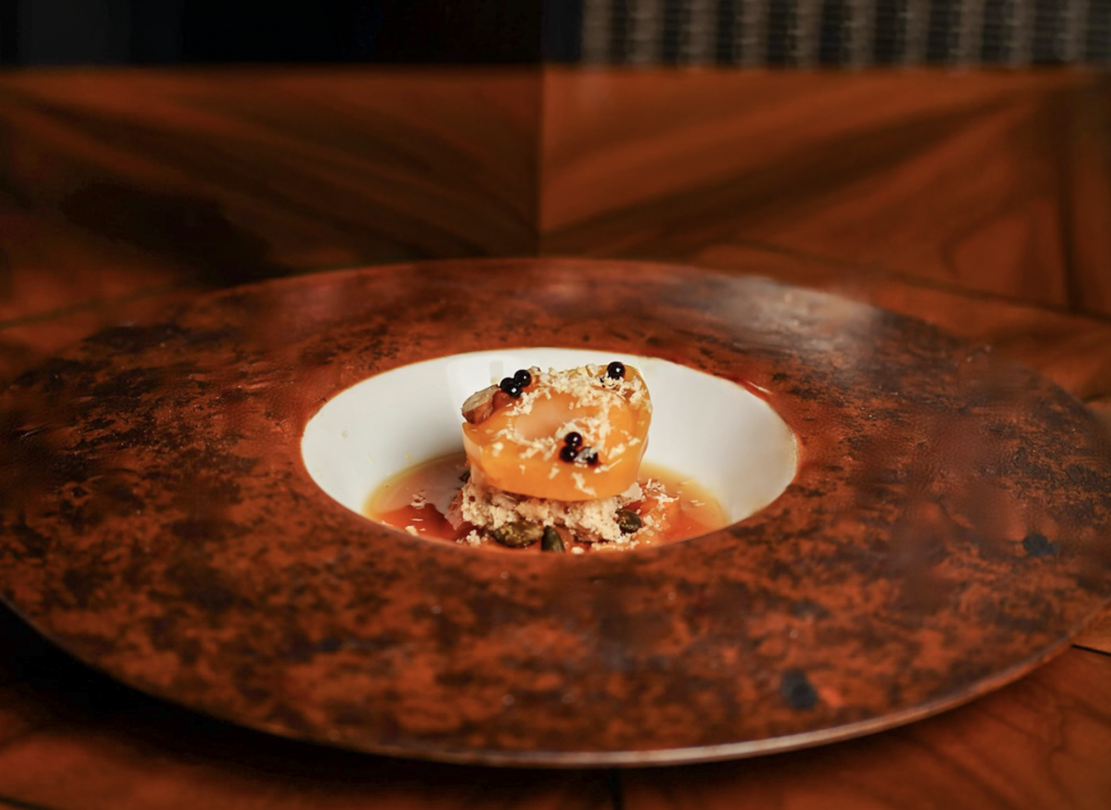 Miglior dessert dell’anno, allestito dalla talentuosa pastry chef Mina Karimi, poiché riesce a trasformare un’idea intima in tecnica leggibile ove la natsukashii – “nostalgia felice”- diventa materia. Il tortellino di Hokkaido e cachi è memoria masticabile; la rugiada di wakame porta un respiro salmastro, il “caviale” teriyaki-balsamico incide, l’amaretto alla nocciola addolcisce senza compiacere. Il brodo di caldarroste alla brace chiude e riconcilia come un focolare: non zucchero, ma narrazione.