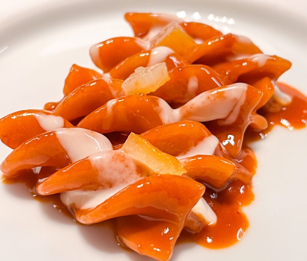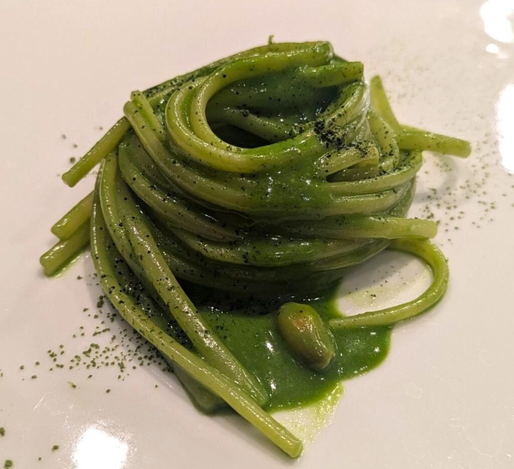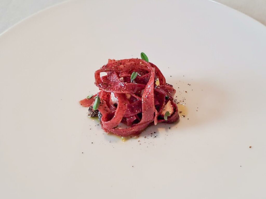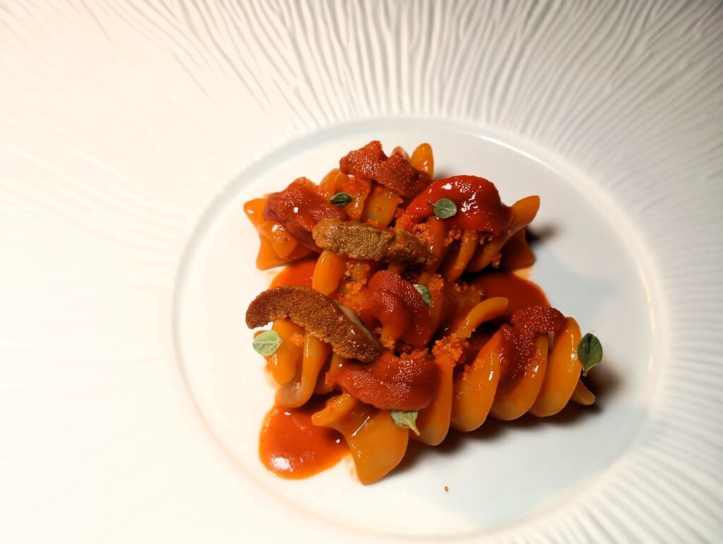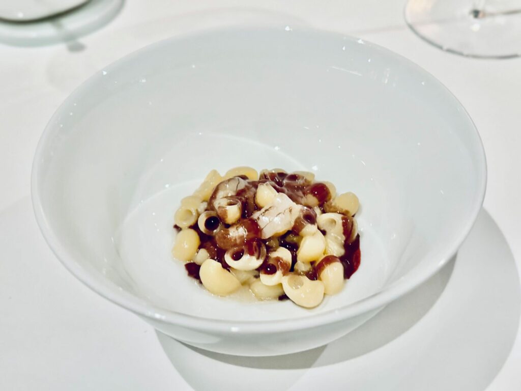 Un formato di pasta assai grazioso in questa proposta, connotata da una deliziosa progressione, studiata a puntino da Andrea Antonini da Imàgo. Partendo dalle note dolciastre e sapide sospinte all’insù sino all’irruzione amaricante del radicchio, con una concentrazione in grado di tracciare una lincea verticale che mette in evidenza, nella sua interezza, il pensiero sottostante, colto e raffinato. Un grande piatto questo, del percorso “Error 14” – Autunno Inverno 2025.