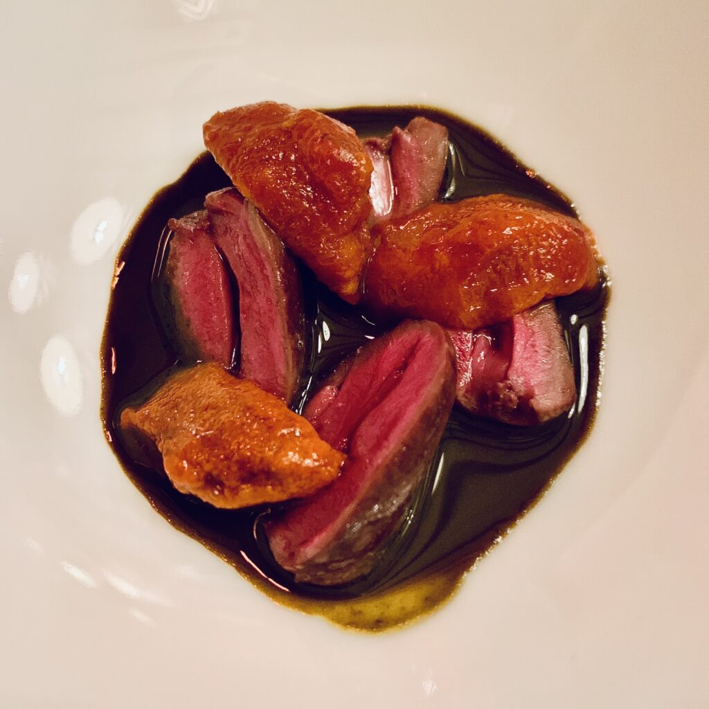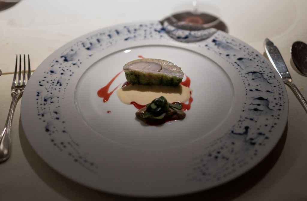 La Triglia, patate boulangere, croco e Fumet de roche “Tanin des Failles Rocheuses” di Arnaud Donckele al Plénitude (Paris). Qui la salsa fatta con pesce di scoglio, Merlot, pastis, cognac, scalogno, brodo di granchi, fondo di selvaggina, riccio di mare, fegato di triglia e alloro, ginepro è un viaggio nel viaggio non solo per come funge da complemento a una divina e succulenta triglia ma per come essa stessa con le sue mille sfumature permeate da eleganza e concentrazione straordinarie assurge al ruolo di compiuta coprotagonista di un piatto memorabile frutto della sensibilità e della maestria di un grandissimo chef.