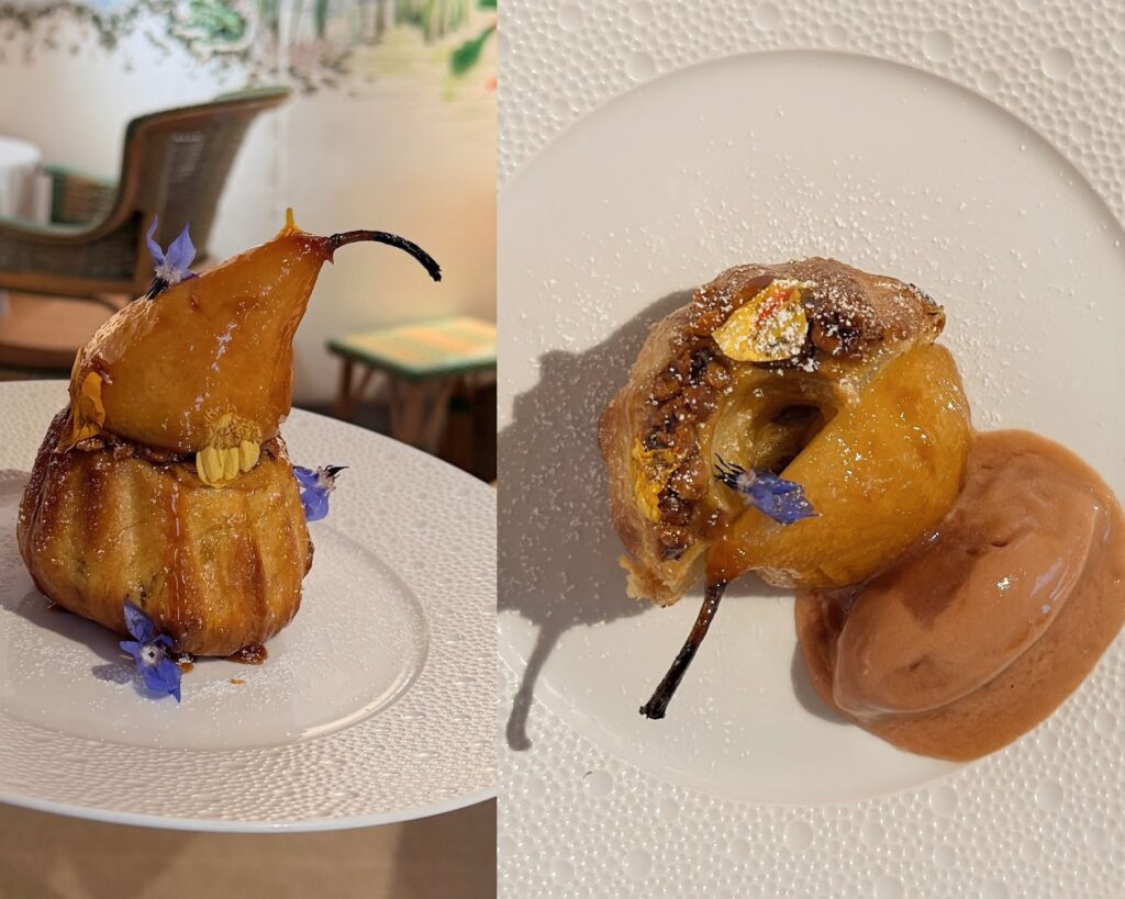 Il tradizionale gugelhupf alsaziano viene preparato da Alain Passard all’Arpège senza uova, burro e latte (le regole del nuovo corso del cuoco sessantanovenne): è la patata dolce a conferire umidità e la giusta morbidezza. La Pera caramellata è sì dolce, ma a colpire è piuttosto il morso, al perfetto confine tra il cremoso ed il croccante. Il sorbetto di cotogna a sua volta è un equilibrismo, tra la tipica dolcezza della mela cotta e l’acidità del frutto crudo. Il boccone che unisce le tre componenti è pura meraviglia.
