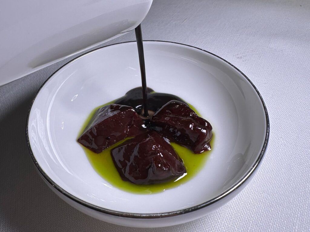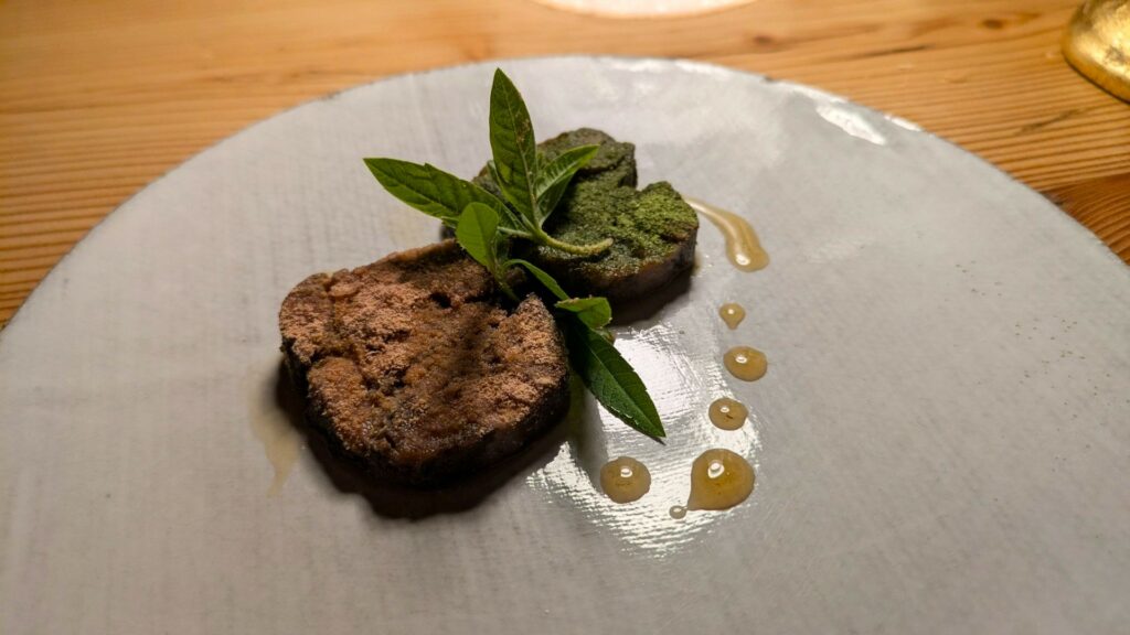 Un daino adulto, che sviluppa nel fegato una sorta di reticolo che ne rende la texture quasi croccante. La carne viene leggermente cotta e servita con olio alla nepitella e una acqua nera, lattofermentata, creata con una muffa da aspergillus luchuensis, fra l’acido e il dolce. Edoardo Tilli è un cuoco visionario, che coltiva l’istinto, in stretta connessione con la natura e il passato, che usa la scienza e la tecnica per far evolvere il suo pensiero, profondo, gastronomico.
