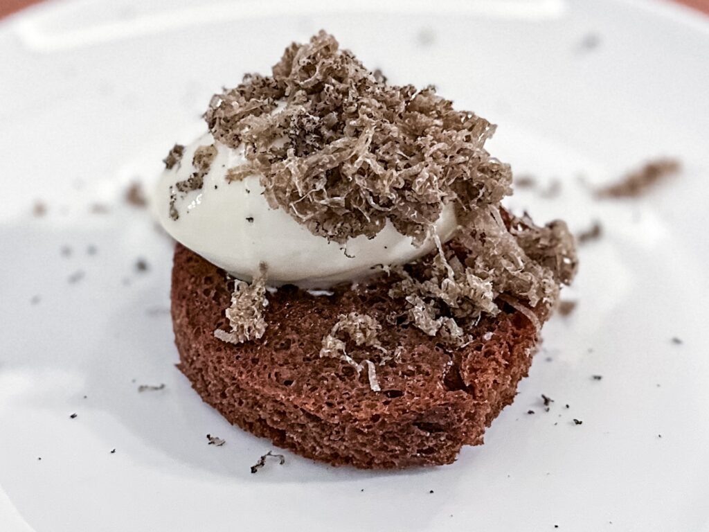 Pane e Nutella di Francesco Sodano al Ristorante Rana. Pan brioche ossidato mediante un processo di tostatura indotta che gli attribuisce un sapore di cioccolato, gelato di nocciole chiarificate, fiocchi di sale e tartufo. Avanguardia nella preparazione, memoria al gusto. Un “Pane e Nutella” dal sapore iconico e persistente che proietta nel futuro ricordi d’infanzia.