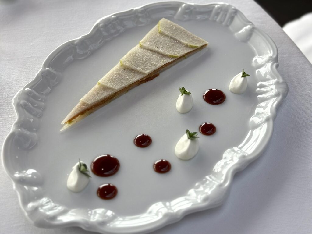 Pera candita caramellata, malleolo, panna, sfoglia croccante, un dessert che sembra semplice, ma lavora in tre registri: dolcezza, freschezza, croccantezza. La pera candita caramellata è il fulcro: morbida, profumata, con una lucidità da pasticceria d’autore. Il “malleolo” aggiunge una nota lattica e quasi primitiva, che dialoga con la panna in un equilibrio inatteso. La sfoglia croccante è il contrappunto necessario — una pausa asciutta, un gesto di struttura che impedisce al dolce di scivolare nella morbidezza totale. Un piccolo capolavoro di Riccardo Camanini al Lido 84.