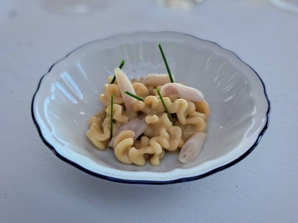 Della Pasta riccia, fegato di cannolicchio e sesamo tostato di Riccardo Camanini al Lido 84 si apprezza, inizialmente, la consistenza. Incredibile, al punto che masticheresti in eterno. Poi, il miracolo della dolcezza e della morbidezza di un ingrediente prezioso e sorprendente come il fegato dei cannolicchi ed il giusto contrasto dato dalla nota tostata dell’olio al sesamo. Un capolavoro!