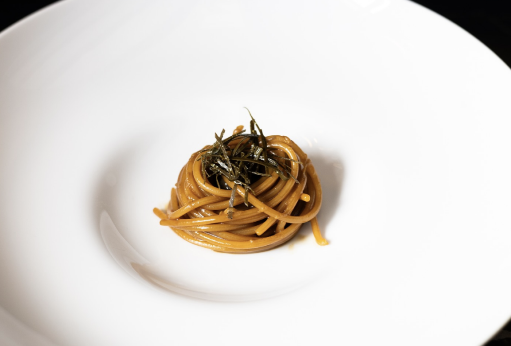 Marco Caputi al Veritas di Napoli; radici e minimalismo. Una profondità che si fa emozione, in un gusto genuino, spontaneo e colmo di intensità. Un’esperienza che coinvolge vista, olfatto e palato, in un equilibrio di misura e verità. Il nido racchiude, nella sua essenza primordiale di custodia, uno spaghetto materico arricchito dal porro deciso, dal limone vibrante e dalla foglia di cappero: un piatto teso, vivo, lontano da ogni prevedibilità.