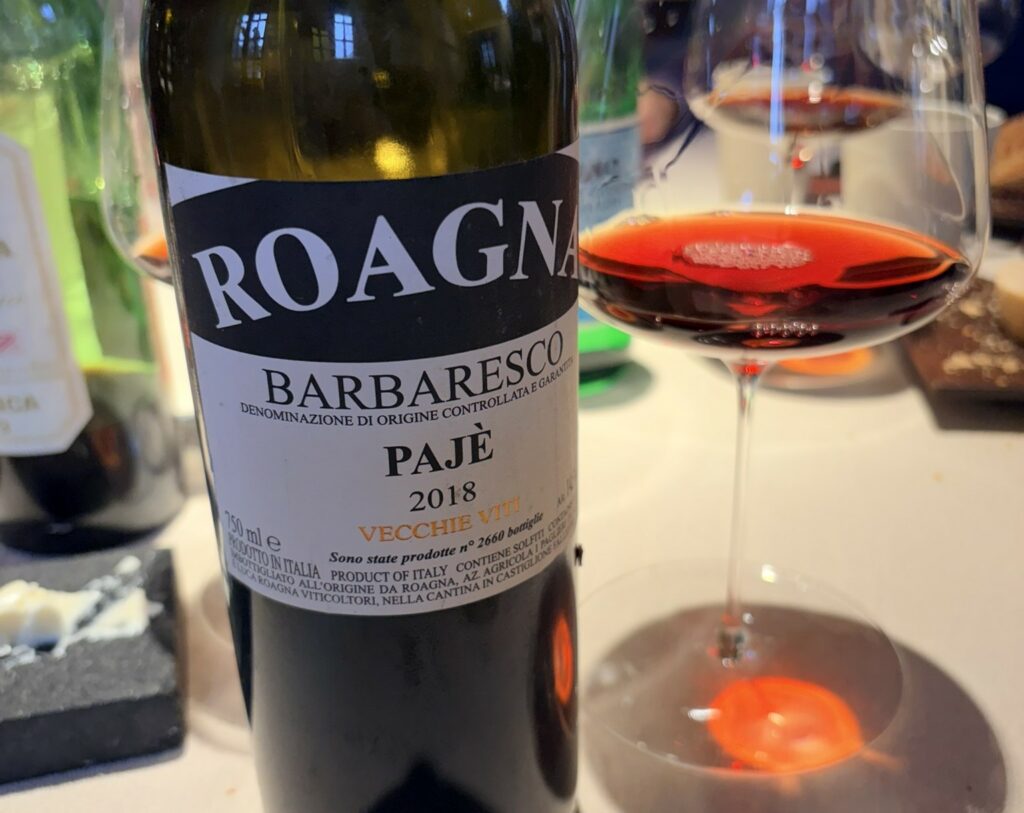 Il Pajè Vecchie Viti 2018 di Roagna è un Barbaresco che unisce autorevolezza e tensione con una naturalezza rara. Avere avuto l’opportunità di berlo al ristorante ha confermato, se non superato, le sensazioni e le aspettative che aveva generato quando lo avevamo assaggiato in degustazione. Proveniente da vigne molto vecchie nel cru Pajè, esprime un Nebbiolo di grande precisione, dove l’estrazione è al servizio della finezza e non della muscolarità fine a sé stessa. Al naso si apre con un ventaglio ampio: ciliegia rossa matura, arancia sanguinella, petali di rosa, poi tabacco chiaro, spezie fini e una traccia balsamica che ne accentua la verticalità. È un profilo profondo, stratificato, che cambia nel bicchiere minuto dopo minuto. In bocca è potente ma mai pesante. Colpisce per la grande struttura, sostenuta da tannini fini e dolci – maturi, cesellati, perfettamente integrati – che avvolgono il palato senza irrigidirlo. La trama è compatta, ma ciò che rende il sorso davvero memorabile è la sorprendente freschezza: una spinta acido-sapida che allunga il finale e dona slancio a un impianto importante.