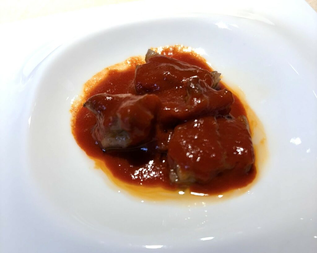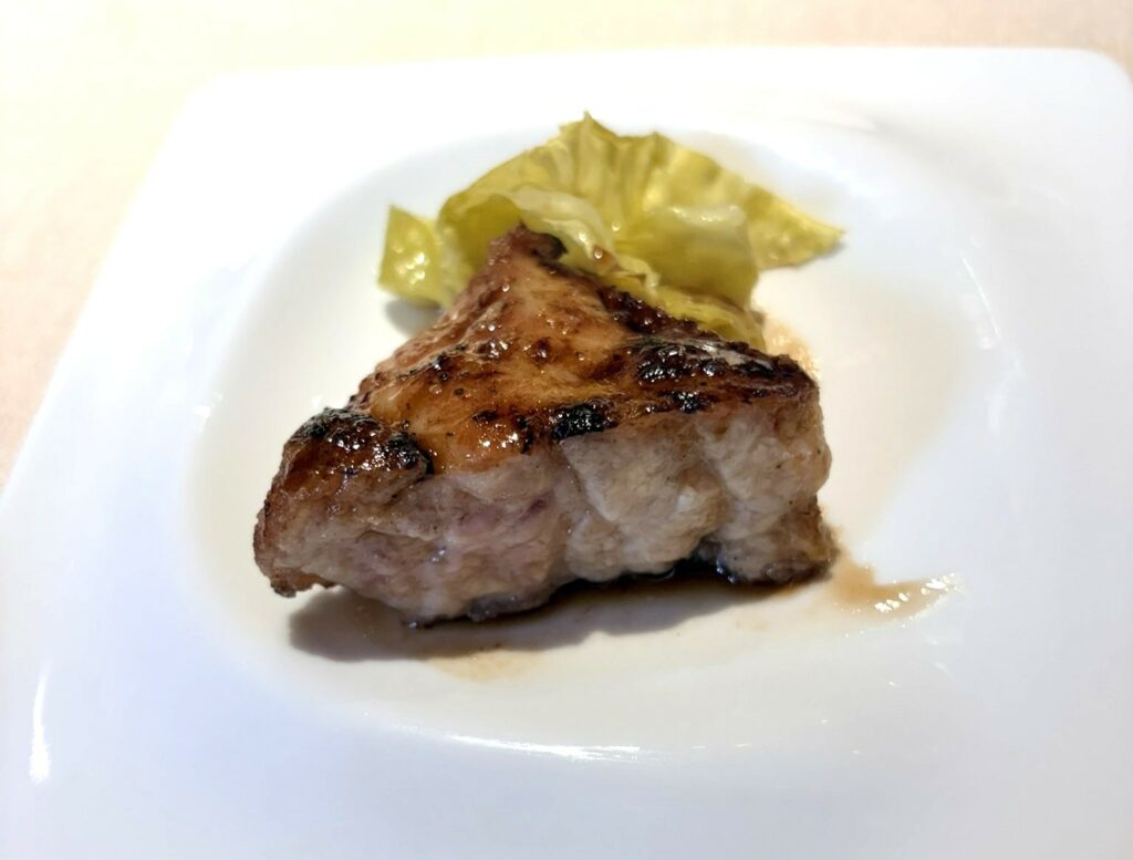 L’esperienza si sviluppa, da sempre, come una partitura essenziale in cui ogni ingrediente è solista e, al tempo stesso, parte di un equilibrio superiore governato dall’indiscutibile abilità dell’asador. Il Bogavante (astice) ha una potenza vibrante, con la corazza appena carezzata dal calore e le carni ancora intrise di iodio accompagnate da un intingolo fatto con carapace e cervello del crostaceo, straordinario. I Piselli lacrima sono un inno alla stagionalità (di questi luoghi), dolcissimi, appena toccati da quel sentore di fumo e brace che accompagna, con grande piacevolezza e senza invadenza, tutto il pasto. La Txuleta non era mai stata così perfetta, in termini materici ed esecutivi: la marezzatura, fusa con precisione millimetrica, si fa seta al palato, rivendicando una classicità che, portata a questo livello, diventa avanguardia.