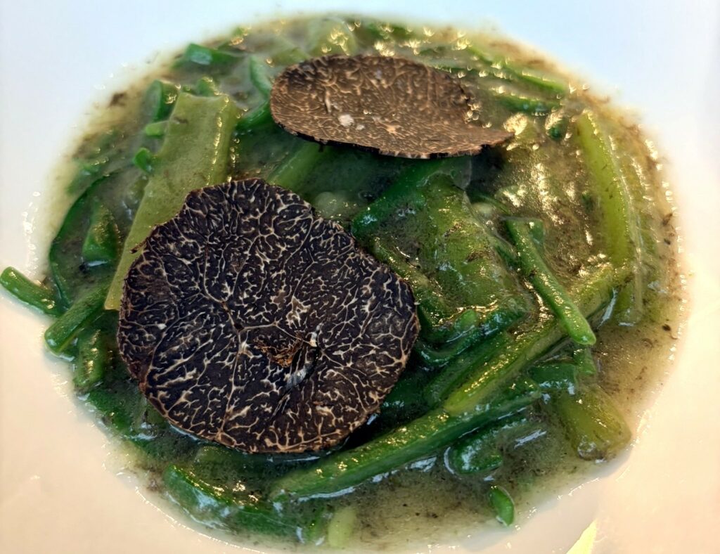 La 'kokotxa' (cococha), o gola di baccalà, è la protuberanza carnosa posta sotto la mandibola inferiore del baccalà/merluzzo. Si tratta di un taglio molto pregiato del baccalà: molto piccola, ricca di collagene e dalla consistenza tenerissima al morso. Le 'gole' (kokotxas al plurale) fanno parte della tradizione culinaria dei Paesi Baschi e vengono cucinate in vari modi e ricette. Tra... Leggi di merluzzo, servite in tre cotture, e quello vegetale, con una Menestra verde (a base di fagiolini e piattoni) costruita su un fondo marino e impreziosita dal tartufo nero. Il percorso entra quindi nel territorio più radicale: le frattaglie di pesce, Callos de bacalao, lattume di merluzzo appena scottato e fegatini di triglia e di rombo. Un atlante anatomico che racconta il pesce nella sua interezza. Infine la brace, nella sua forma più pura: tranci di pesce bianco, testa di cernia e, a chiudere, la sogliola.