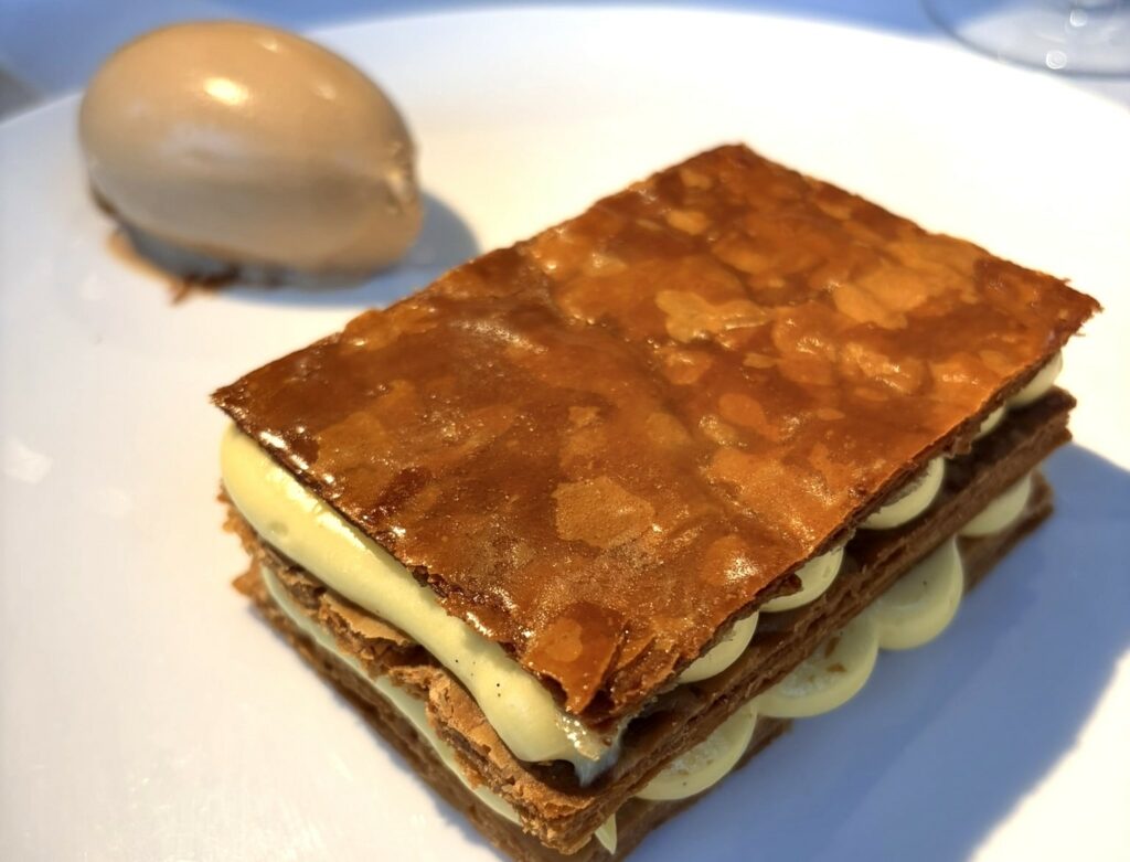 E giungiamo, quindi, alla annunciata Sogliola alla brace, suggerita in sostituzione del rombo, che non ha nulla da invidiare al piatto simbolo della casa. Cottura millimetrica, carne compatta ma delicatissima, una gestione del calore che lascia il pesce integro nella sua essenza, esaltandone dolcezza e profondità senza mai forzarlo. Non un’alternativa, ma un altro vertice.