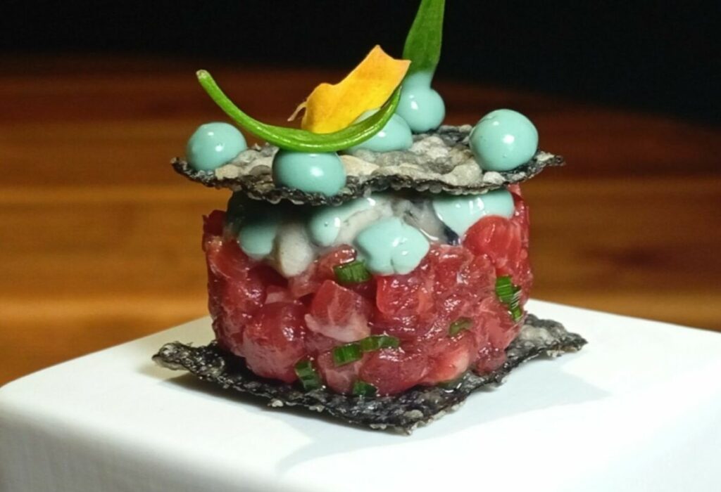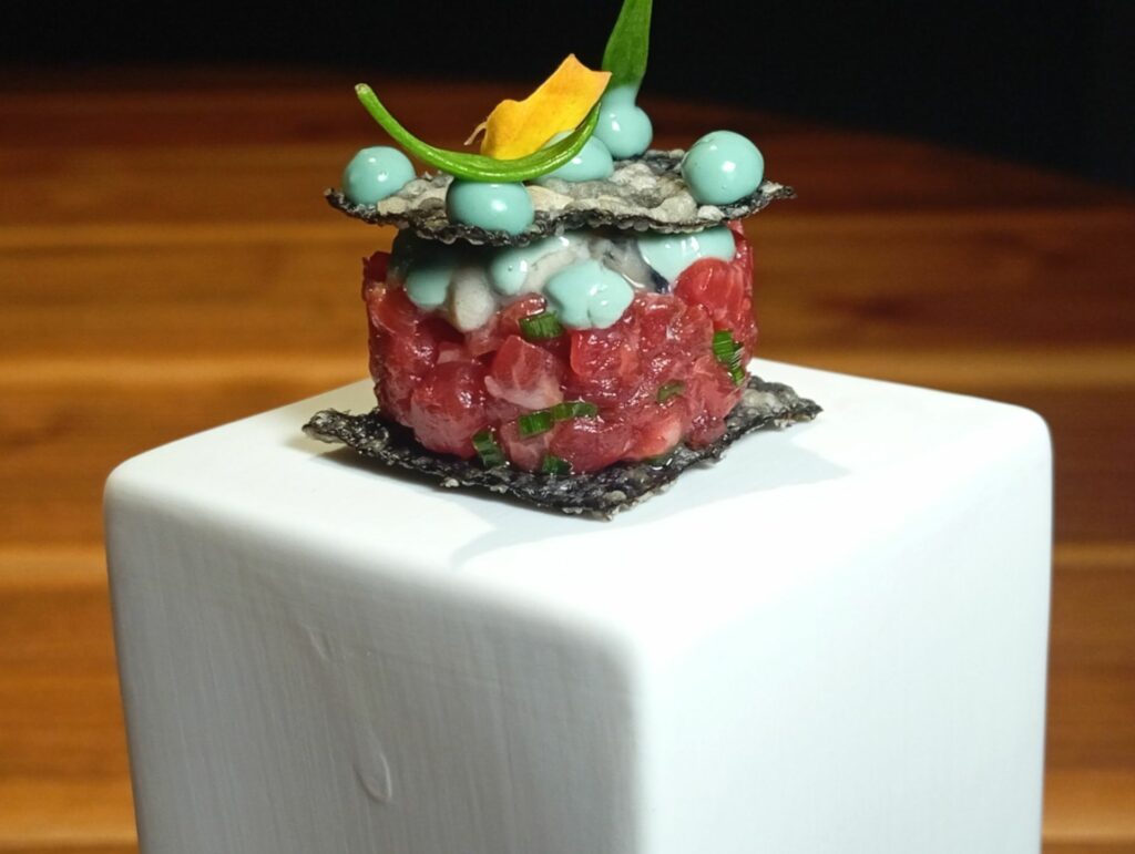 IL PIATTO MIGLIORE: Umami di terra: sfoglie di alga nori con crudo di lombata di vaca vieja, ostriche a crudo, alga spirulina e erba cipollina.