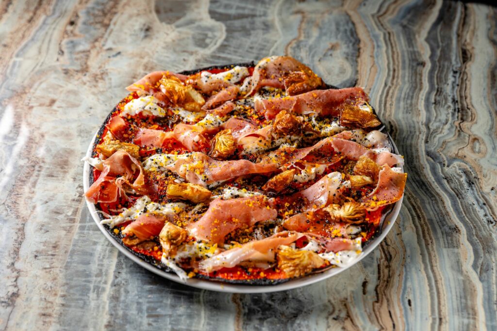 Sicuramente la Capricciosa di mare. È una pizza che nasce da un lavoro di tanti anni sulla maturazione del pesce. È una reinterpretazione della capricciosa di terra: sotto c’è un pomodoro che in realtà è un fondo ricco di umami, fatto con il collagene del pesce da scoglio; sopra c’è il prosciutto di mare fatto con i pesci del territorio e la bottarga di mare. È una pizza complessa, ma allo stesso tempo riconoscibile da tutti.
