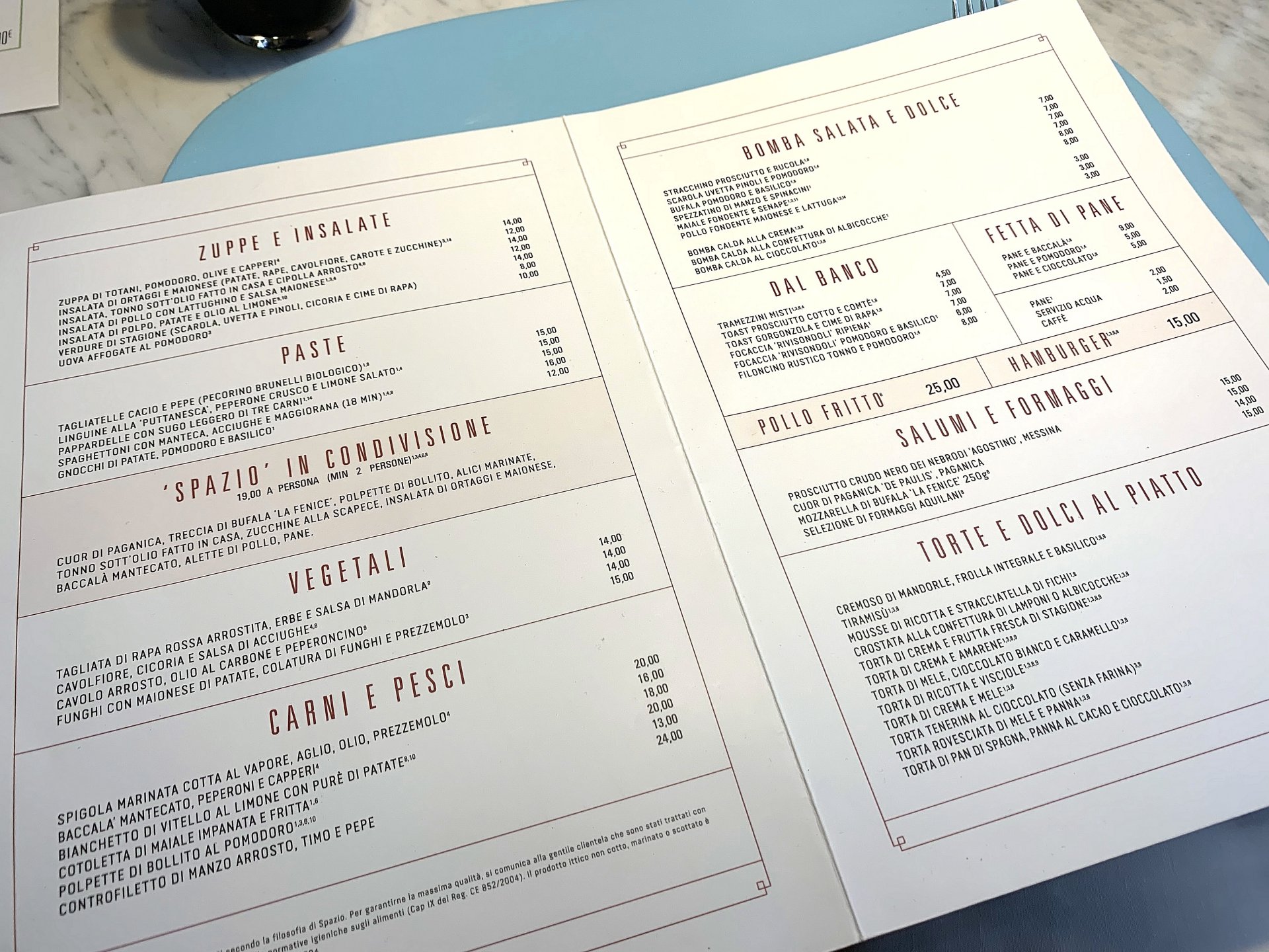 A Spazio Roma si comincia la mattina con le colazioni, ricche e intense, pervase da ogni prelibatezza immaginabile, sia dolce che salata. Si prosegue per il pranzo e per la cena, in entrambi i casi con proposte più semplici, ma non elementari nella preparazione e nel gusto espresso, affiancate da qualche preparazione più complessa in linea con ciò che anche si trova nello Spazio milanese. E trasversale, ma non meno importante, il ricco menù di Bomba, da leccarsi i baffi senza smettere un secondo.